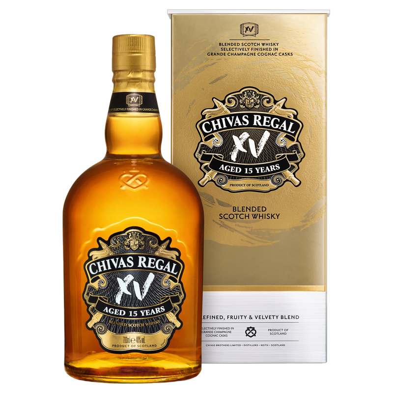 Chivas XV is a luxurious blended Scotch whisky crafted for celebration, offering a refined and velvety drinking experience. Aged for 15 years and selectively finished in French oak cognac casks, it delivers an unmistakably sophisticated character. The nose is rich and inviting, with stewed red apples, orange marmalade, honey, cinnamon, and juicy sultanas, while the palate unfolds smoothly with fruity notes of poached pears, butterscotch, and caramel toffees. Rounded and elegant on the finish with a gentle touch of vanilla, Chivas XV is an opulent whisky designed to elevate any occasion.