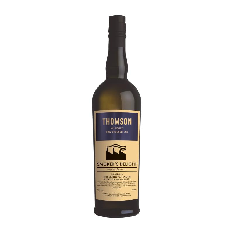 Thomson Whisky Limited Edition Smoker's Delight - Exclusive to Super Liquor with only 270 bottled from Cask #14. This Single Cask Single Malt whisky is a limited edition release from The Thomson Distillery, New Zealand. Made from 100% NZ grown malted barley, smoked with local peat, triple distilled through copper pot stills, and matured in a single ex-Tennessee whisky barrel - it's a distinctly NZ dram. This is the very first triple distilled peat smoke single malt released by Thomson Whisky. Cask 14 has been carefully selected from the Thomson barrel house for your enjoyment. Cheers to that.